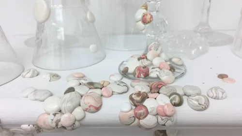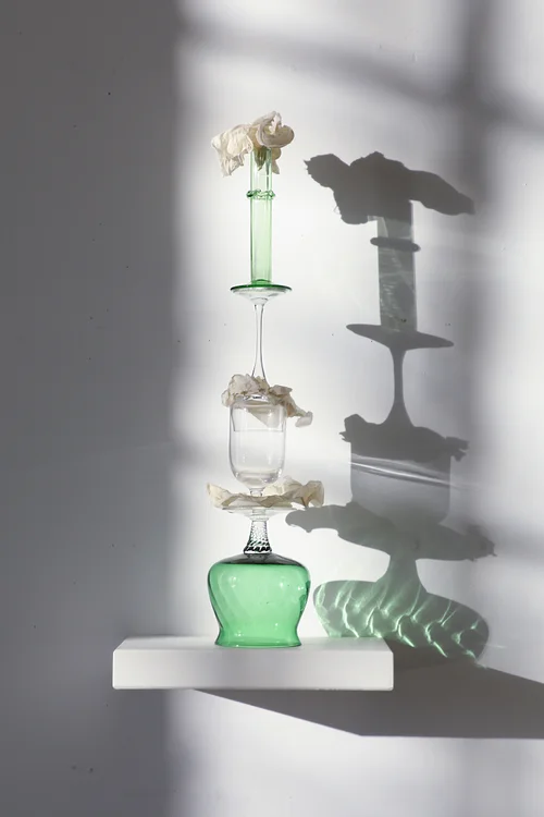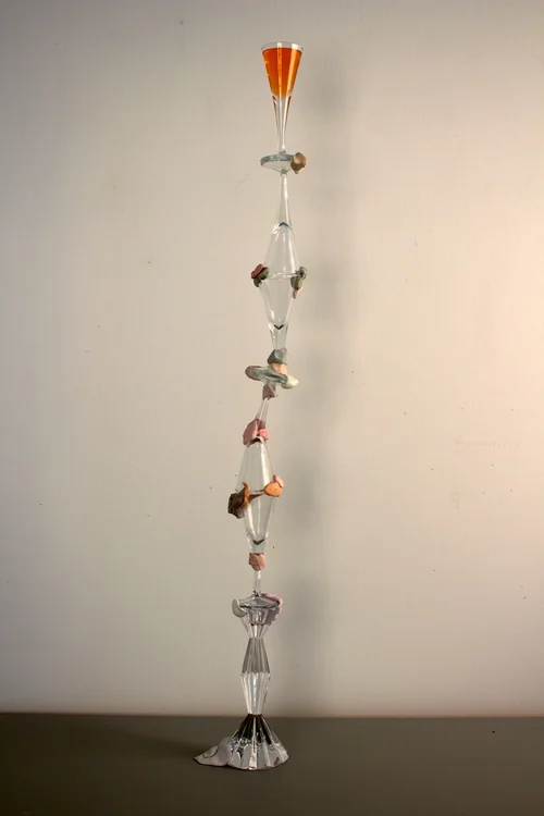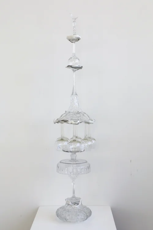 Through the delicate stacking of glassware - gleaned from the local glut of castoff household treasures - the work explores our impulses to collect, save, purge, and replace. Items that were formerly desirable, but may have been damaged, separated from their sets, or gone out of style draw attention to the temporality of value and privilege. Chewing gum-inspired adhesive material and bits of crumpled paper add a sense of haphazard fragility to the constructions, and may evoke sticky childhood lessons in proper manners. Highly precarious, viewers are cued to be sensitive to the ever-present potential for calamity or loss. The artist's commingling of tactile pleasure and anxiety reflect her ambivalent relationship to culturally specific notions of domesticity, beauty and taste. Her repurposed juxtapositions remind us that new relationships are forever possible, even for the lost and broken.