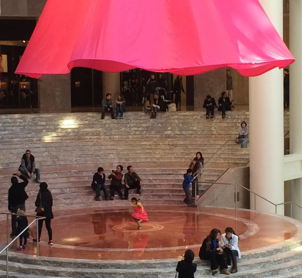 Installed high up in the grandeur of the World Financial Center’s iconic Winter Garden, this kinetic sound installation presented viewers with six gargantuan skirt forms that gracefully swirled to and fro inside the glass-vaulted pavilion. These bright coloured luminous sculptures became a femme choir of sorts, with each emanating a single voice that was heard with singularity when standing directly below, part of a six-track unified audio score. Both celebrating strides in gender equity and acknowledging setbacks, the singing “skirts” offered up sounds from the big stage to the shower, from call-and response traditions to spontaneous riffs. The vocalizations, devised to periodically burst out upon the atrium, encouraged passersby in this male-dominated corporate space to pause and reflect on the connections between gendered roles and architectural space, and on the power of the feminine when it is seen and heard.