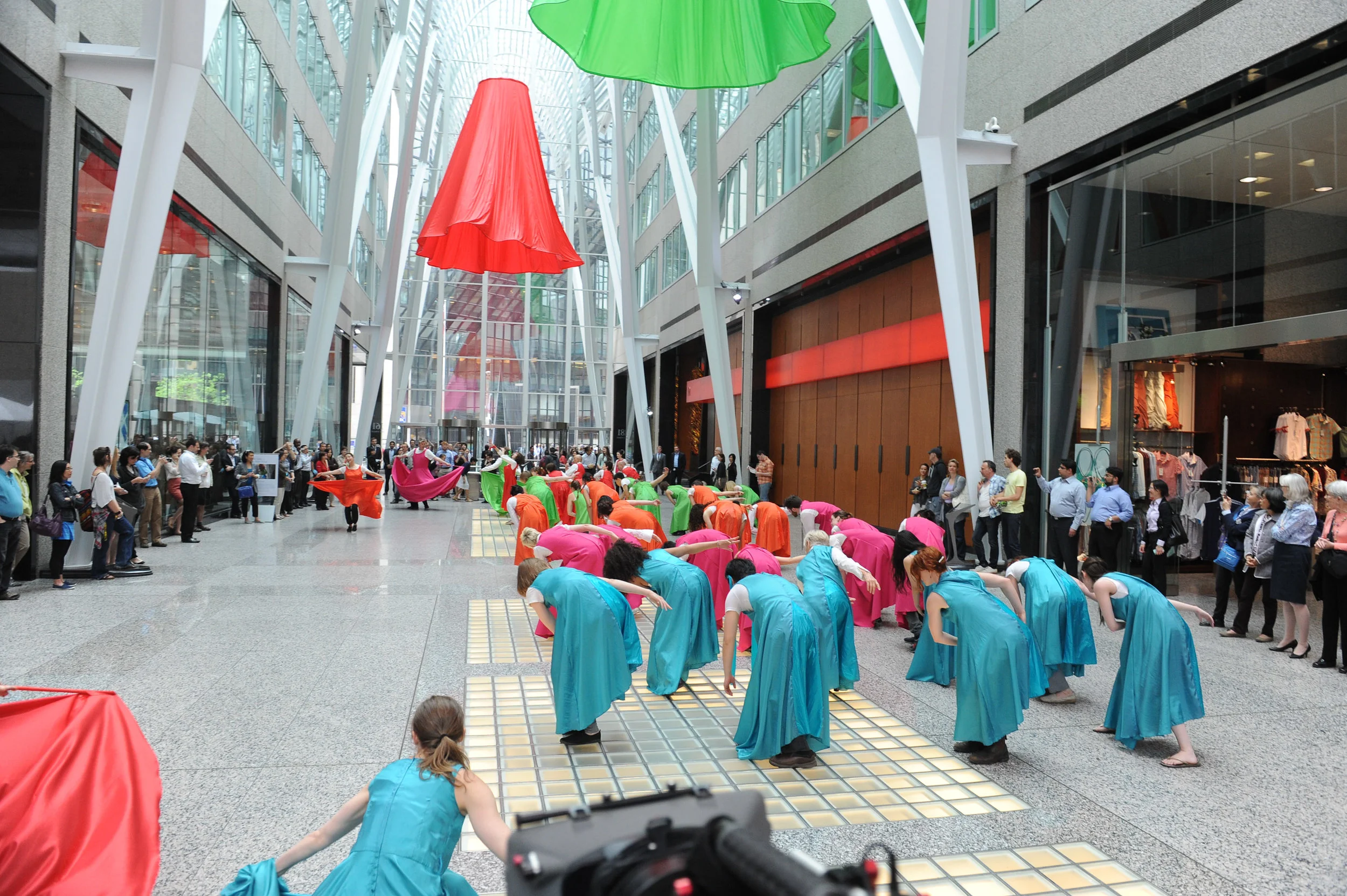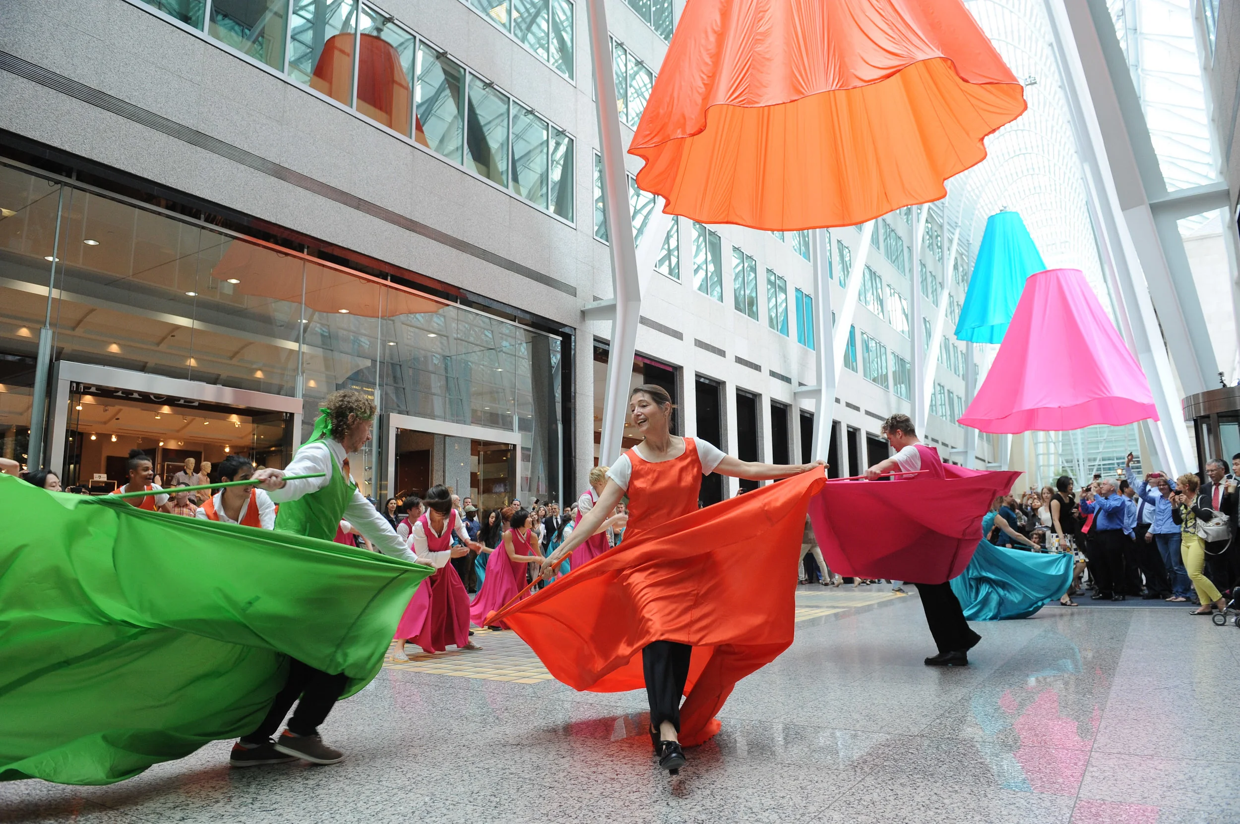 In conjunction with the Toronto version of Soft Spin, the bustling lunch hour at Brookfield Place was playfully interrupted with an unannounced site-specific dance performance. Conceived by Heather Nicol and choreographed by Andrea Nann, the work began with sixty men and women slowly shedding their business attire to reveal flowing, colourful dresses inside. Members of the Radiant Brass Ensemble improvised based on a score composed by Bruce Nicol. Below the oversized sculptural forms overhead, the musicians and dancers moved through the vast space toward one another, gradually forming groups, transforming the atrium into a gently swirling parade of colour and sound, and sculptural form.