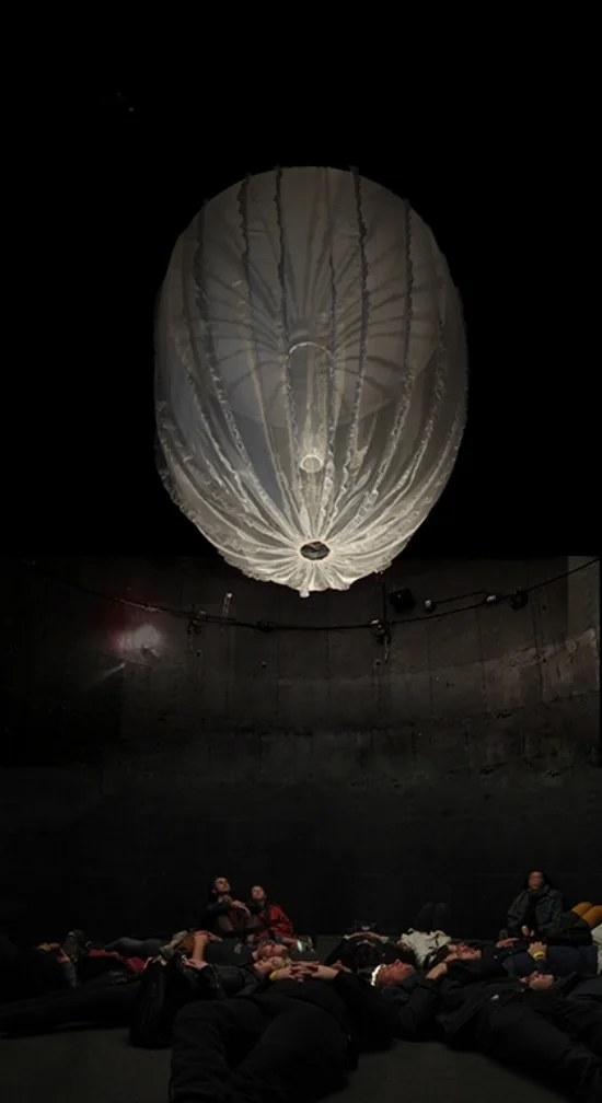 Ontario Place is a decommissioned, iconic theme park on Toronto’s waterfront, where a concrete silo once housed an educational display about tornados. Inside that sheltered, reverberant space, my installation explored the need for safety in a chaotic world. Audience members entered a cavernous space in which a large hanging “pod” formed from delicate white gathered fabric sewn onto an aluminum armature emitted the sounds of a child reading from the didactic panels of the original exhibit. Joined by the voice of an adult woman, symbolizing both teacher and mother, the sound track also wove in songs and sounds about wind along with a haunting recitation of Ontario’s historic anthem. This atmospheric, interactive work considered the passage of time, memory, and the unknowable future.